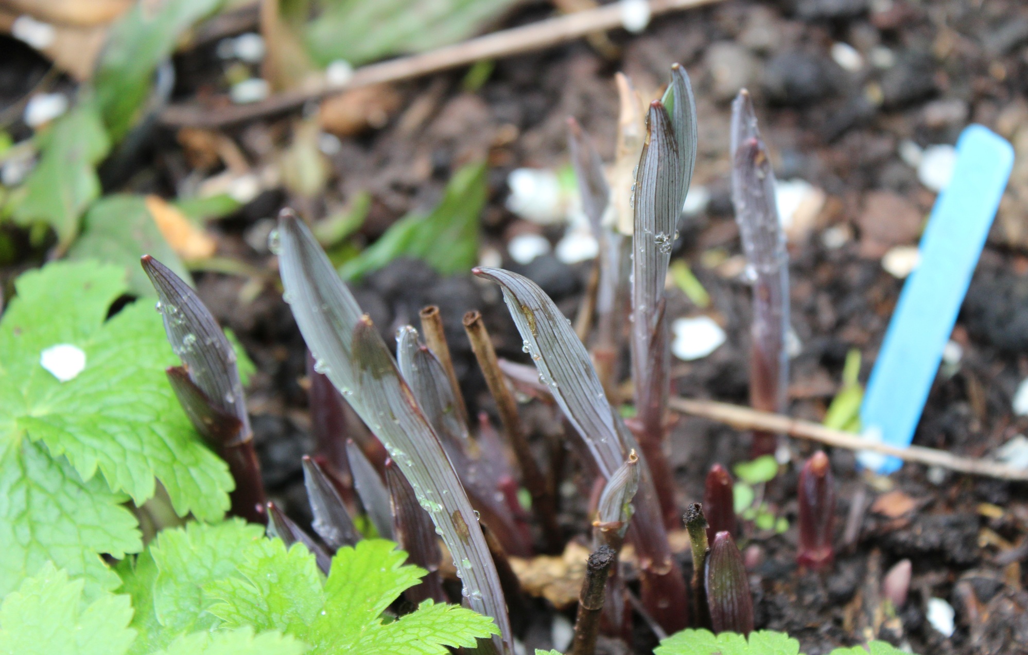 The rather ominous spears of Uvularia grandiflora are emerging from the deep. This shade lover is one of my favourites, the US have some splendid woodland plants, and its Hammer House of Horror entrance makes it all the more special.