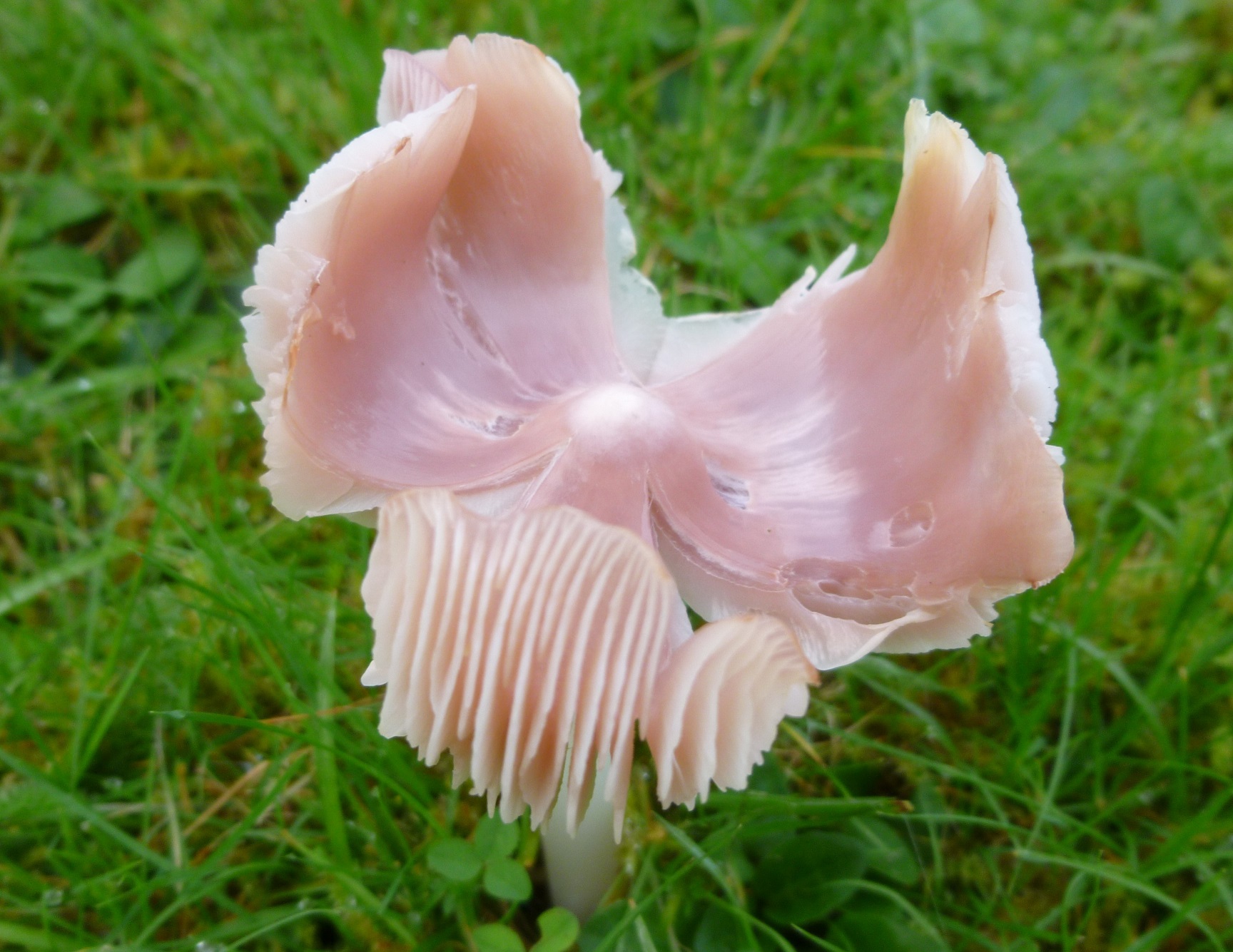 P1020789 (2)My knowledge of mushrooms is limited to fry ups and risottos.  Apparently it has been a good year for the edibles but I am far too cowardly to pick my own.  This combination of ignorance and cowardice has kept me alive so far.  My poor fungal education does not prevent me from appreciating their beauty and today there were a fine assortment on the bottom lawn.  These ranged from deepest red through additive orange and custard yellow to this palest pink waxcap.  It is also known as The Ballerina and I am undecided as to whether it is a thing of beauty or would suit a supporting role in a horror film/sci fi movie.