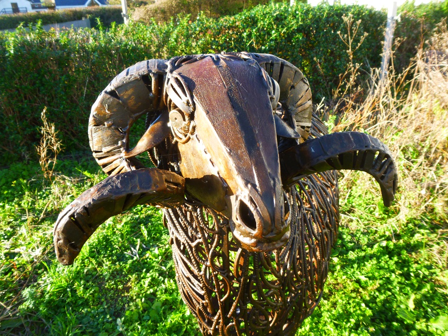In the next few weeks there will be some new characters in the Off the Edge Show. Let me introduce you to one of them. His name is Ram. In case it has escaped your notice, he is a lifesize (if not larger) sculpture of a male sheep, he has a rather mischevious glint in his eye and is generally rather wonderful. Ram was adopted by Odette Bodette and brought back to North Devon for a life of love and the ocassional oiling. He resides in the front garden of Mrs B’s new home, “Waite ‘n Sea”, with little to enhance his burnished flanks but a carpet of weed, a grisellina hedge and a hydrangea. My job is to create a seaside garden for the lady’s delectation. As Ram has been concreted into place (to avoid liberation by local rustlers) we will have to design and build this garden around him. Imagine him as a salt marsh lamb, grazing on samphire and sea kale. There is a fair way to travel before his new pasture is complete, but I am full of optimism and ideas. Of course I will not improving Ram’s environment on my own, you will be pleased to hear that none other than Superbaz will be in charge of hard landscaping. It promises to be very interesting ……