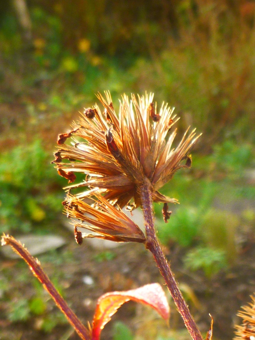 Yesterday, after a week of rain and gales, it was a pleasant change to experience some winter sunshine at Lavinia and Lionel’s. The day was especially important as it was one of those milestones that we invent for ourselves but all the same are of consequence; it was my last day of work before Christmas. For the record it turned out to be a very satisfying day. It saw the completion (!) of Phase One of what will hopefully come to be known as The Grass Border and those plump alliums were planted before they shooted and shrivelled.* The two L’s then fed and watered their grateful gardener in a way I don’t deserve (always a sucker for a muffin!) before I set off on my merry way. There had been a couple of sharp showers but this small hardship was rewarded by a clear, bright and optimistic rainbow. This ceratostigma seed head was looking fittingly seasonal in the low light and the acrobatic goldfinches will enjoy these tasty morsels if ever their fast-food station goes dry. In the meantime we can enjoy their burnished beauty.