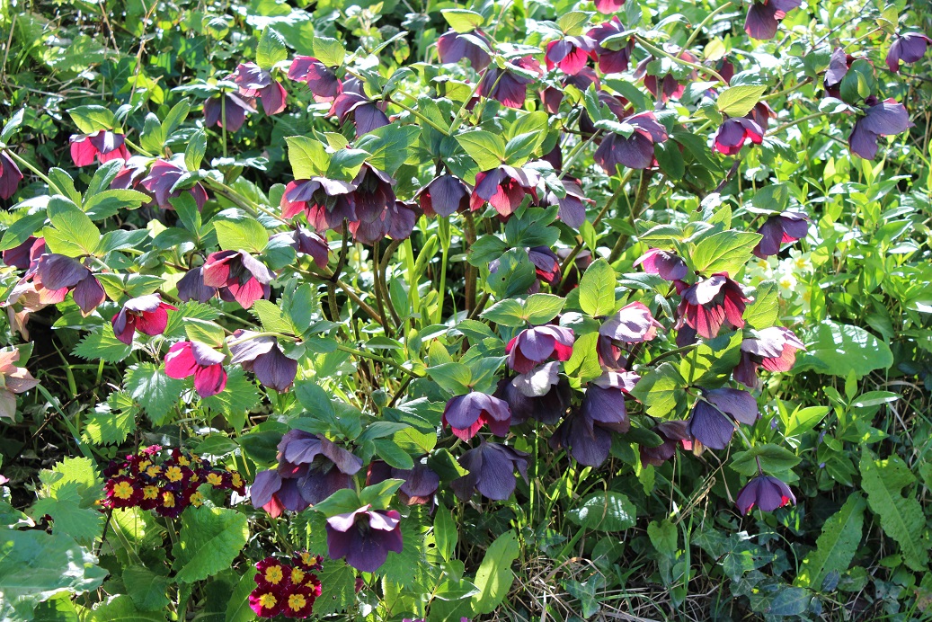Wonderful photo–the hellebores and the primulas. It looks so sunny and bright. (Very grey here the last few days).
