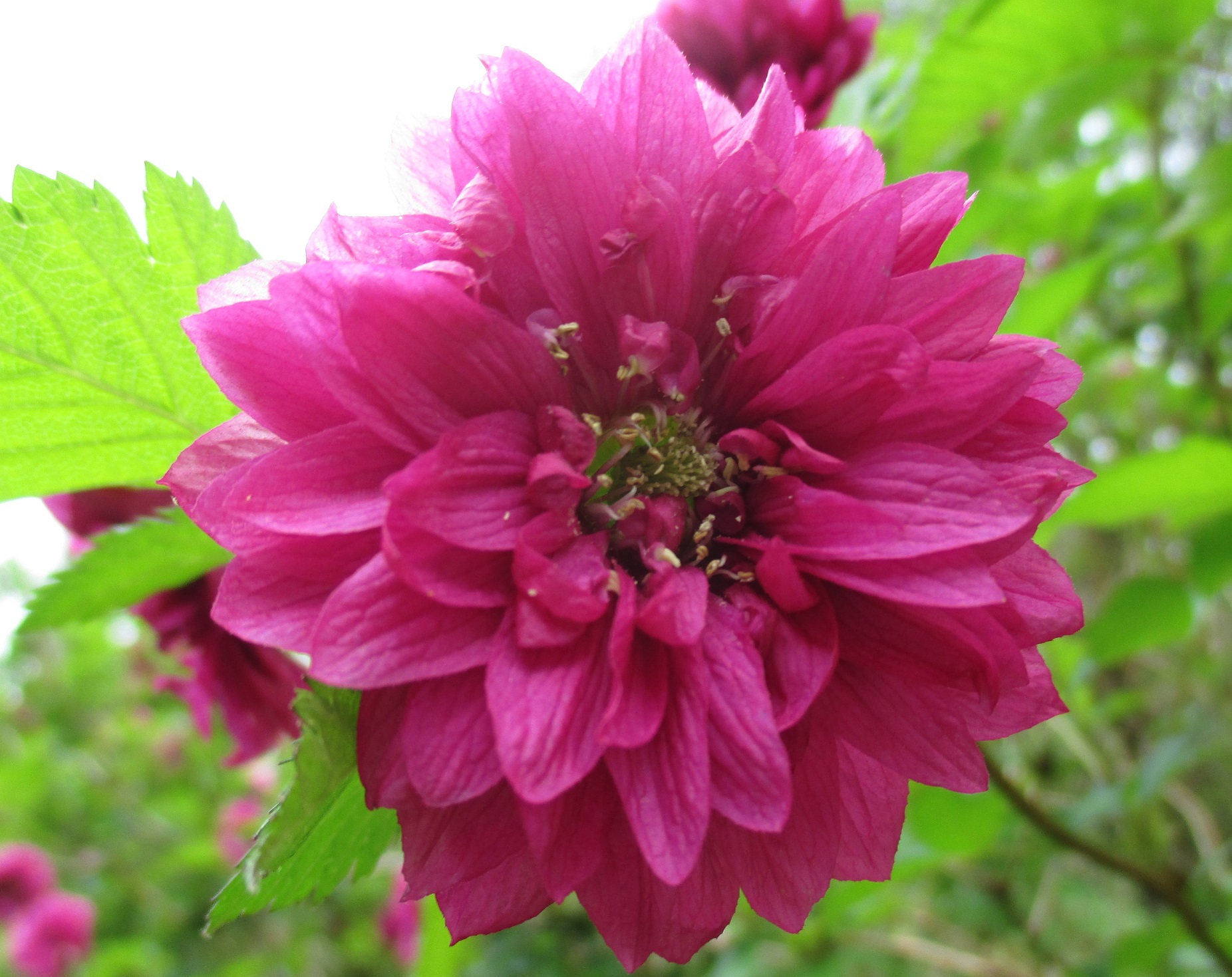 I guess the close-up photography makes all the difference. We had salmonberry growing all along our (extremely long) driveway at the old place (two moves ago). It was an exciting harbinger of spring, but I never looked closely at the flowers. I know they weren’t double. The berries were a dull orange and did not have much flavour.