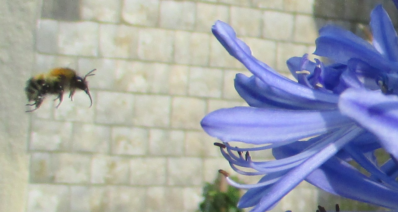 Beautiful, my ‘Midnight Star’ is just about to make an appearance, your Agapanthus has beat mine to it. How on earth did you manage to catch that bee as well?