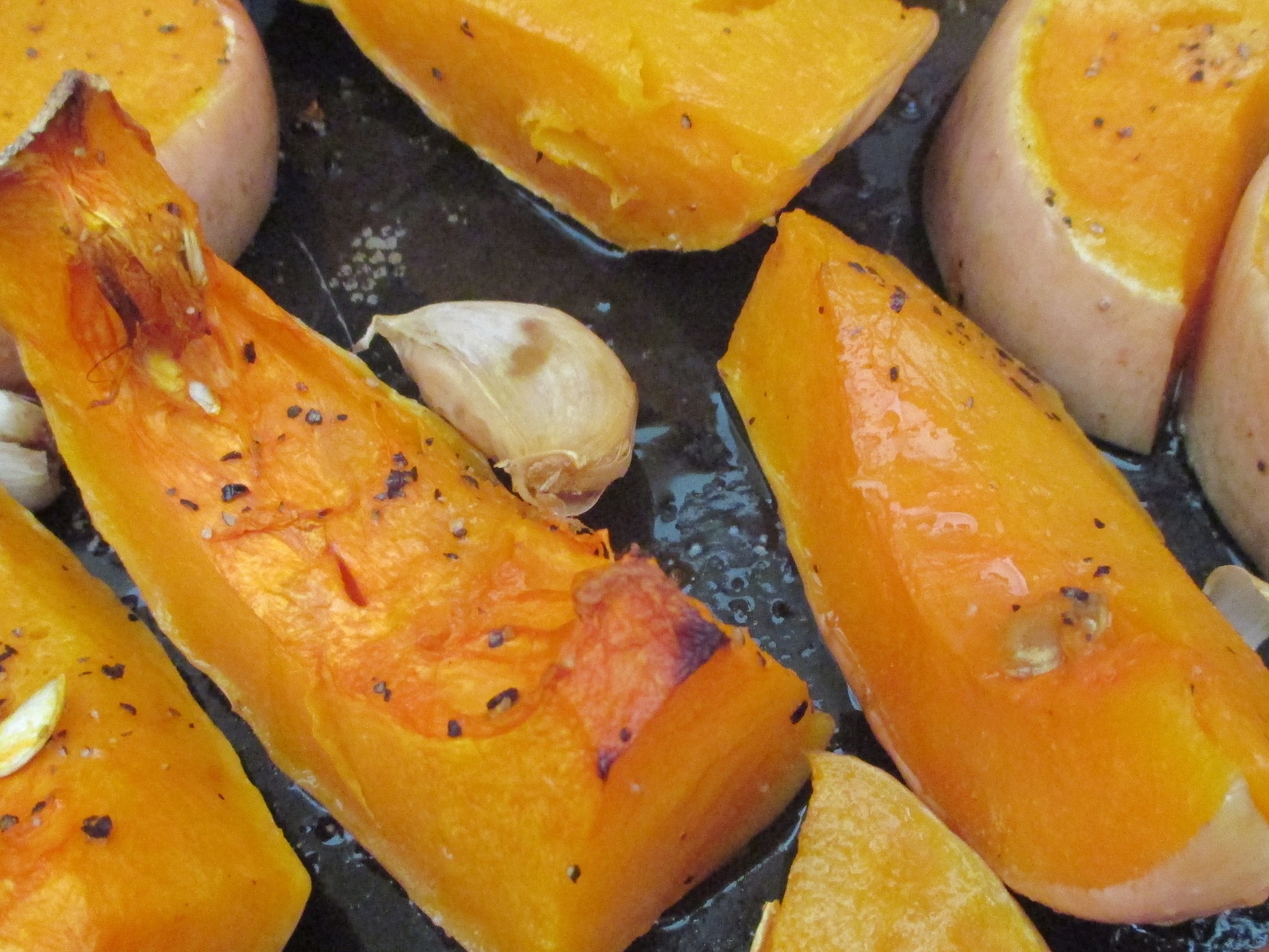 First cut up your squash and remove the seeds, don’t bother peeling. Size is directly proportional to cooking time. The smaller the quicker, the larger the longer. I’m sure you had worked that one out already, but there is always someone who gets a little confused (yes, that’s right, you in the corner!). Arrange carefully in an anarchic manner in a roasting tray. Don’t worry if some seeds make their way in to the pan, they make a nice and crunchy treat for the cook later.