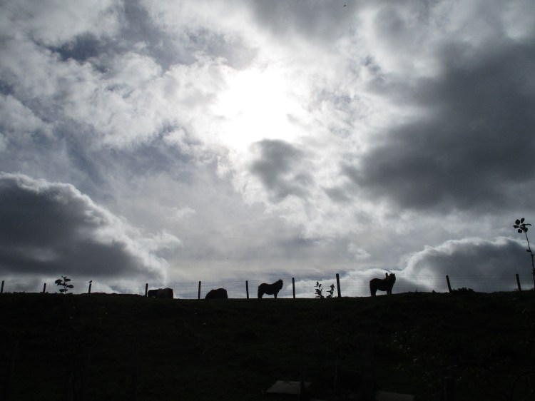 All of a sudden I had the strange feeling that I was not alone, that I was being watched.  Slowly I turned and behind me, on the brow of the hill, silently watching my every move, were none other than the infamous Pony Posse.   We have history, me and this gang of reprobates.  Not only was there the Great Pasty Theft of 2015 but also previous orchard incidents, as I wrote about in Deception Explained. I had heard that they were out on bail, and might have guessed they were involved.  It had their hoof prints all over it.  All I can say is “don’t forget who is wearing the white stetson in this movie”.