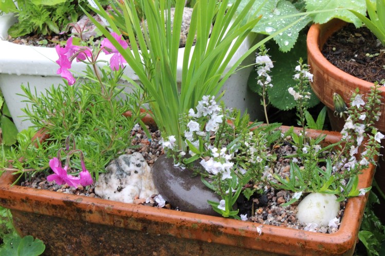 Last weekend I went to the Post Office and came home with three new alpines for my diddy little clay planter. On Ilfracombe High Street there is an antique/collectables shop that from time to time has a small table of plants at the front. As I walked on the other side of the street I could hear them calling my name “Gill, Gill” they whispered, “cross the road, come and see how beautiful we are”. So I did, and four came home with me. The three planted here are Phlox sublata ‘McDaniel’s Cushion’, Iris setosa (Dwarf Form) and Veronica prostrata ‘Carrapit White’. The fourth was planted elsewhere and will have to wait for another day.