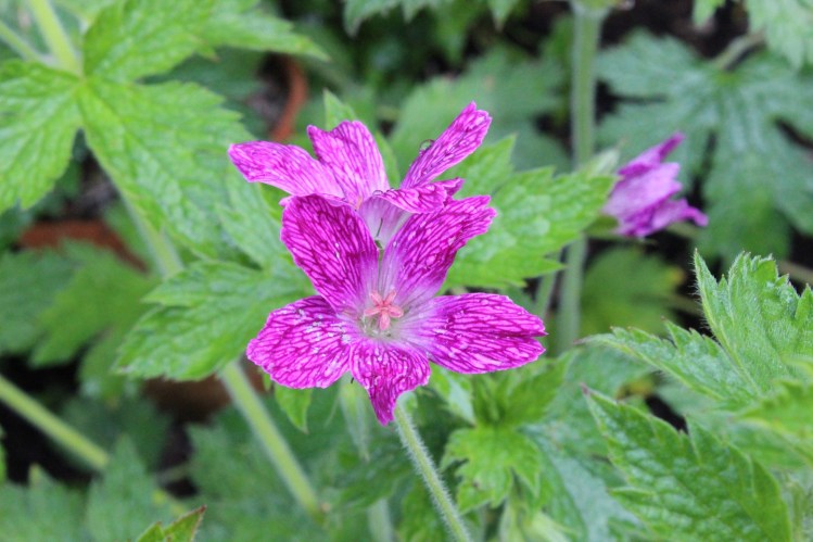 This dark veined geranium was a sport on a plain pink plant in a client’s garden. With permission I brought it home to nurture. It seems to be healthy and upright and has lots of flower buds. A nice surprise.