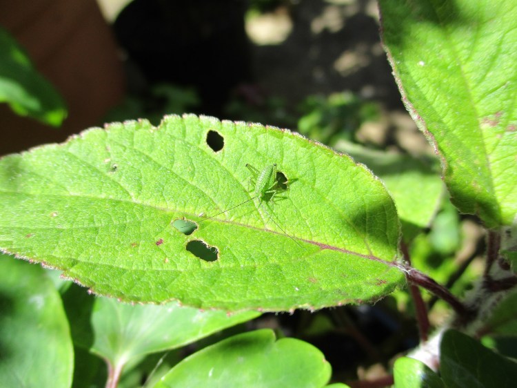 In my little garden I don’t have the benefit of potting shed or proper greenhouse. When I do any potting up, pricking out or some such fiddlings, I sit on the bottom step of the set towards the top of the garden with my compost, pots and the “to be sorted” arranged about me. I then settle down with a nice cup of coffee, which in matter of moments has compost floating on the top, and enter my own little world. It was then that I noticed this chap on a Salvia elegans, possibly the diddiest grasshopper in the world. Splendid antennae though.