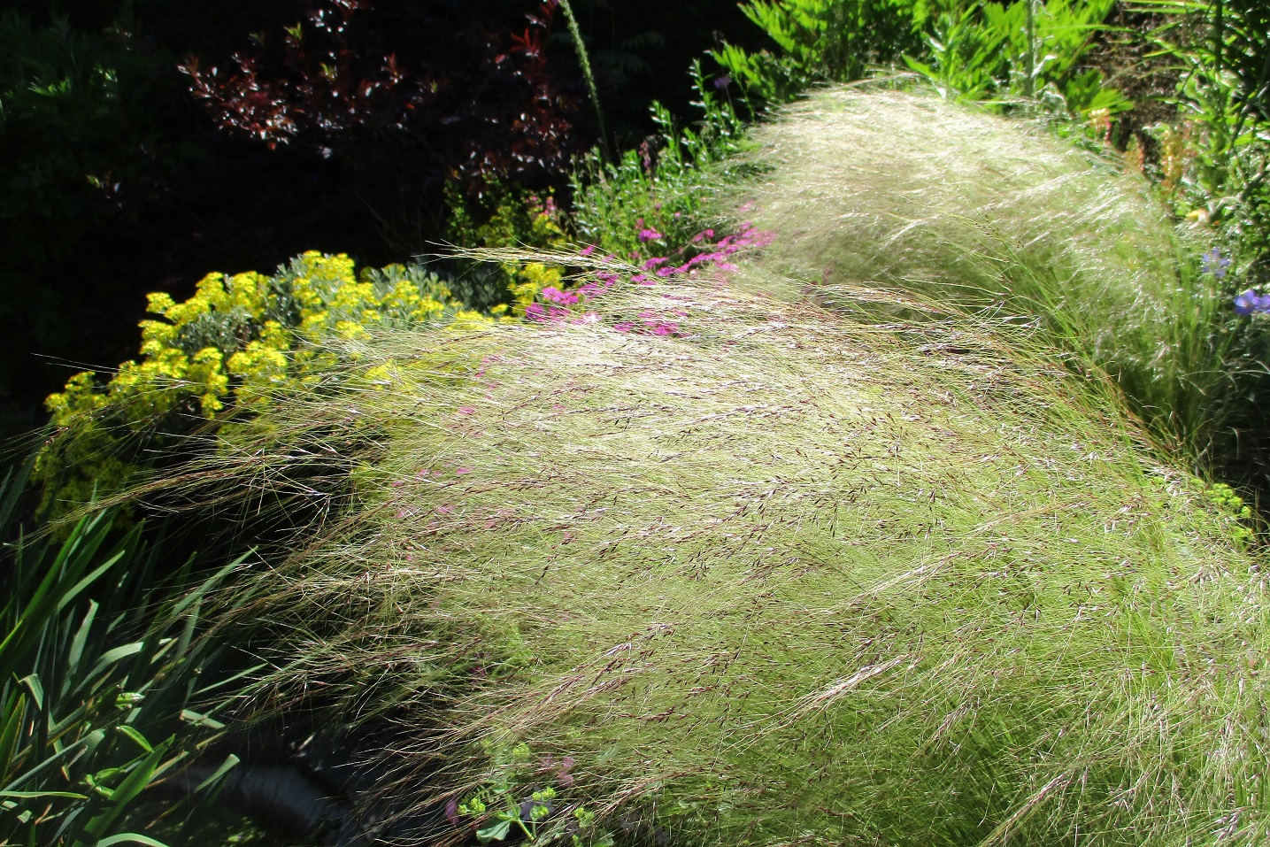 Whether you are calling it Stipa tenuissima or Nassella tenuissima, the combined effect of sun and wind on the Mexican feather grass is just the same.  Poetry in motion.