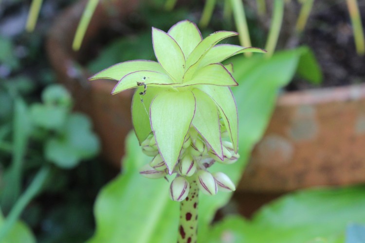 Next a eucomis, full name unknown. It was a bit of a surprise when it appeared. I don’t remember ever acquiring one, by fair or foul means. It seems to have made itself at home all by itself. No complaints though, I am always open to those kind of unexpected events.