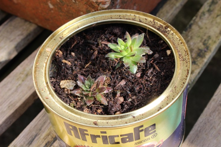 Last year my little brother and his family went to Tanzania on holiday. As they are what we affectionately know as “The Cloggies”, ie they are mostly Dutch and live in the Netherlands, they very kindly posted me some African coffee instead of a postcard. Unfortunately, possibly due to my extensive criminal record, the Customs and Exise people intercepted it. They then proceed to break the seal, rootle around inside for a bit, before sending it on to me. I decided not to drink the coffee. The empty tin makes a rather nice container for a couple of baby sempervivum. Thanks bruv, it was a nice thought.
