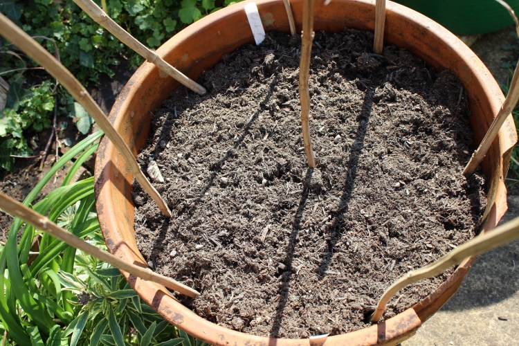 Now we have a pot of radish and spring onions, well the potential for them anyway. This is a feeble grow-your-own attempt. I made a bit of a boo-boo and bought seed tape for the radishes. It is weird stuff. A bit like knicker elastic. Nothing has germinated yet. Perhaps it was knicker elastic after all. Like the true professional I am, I have been checking for action several times a day. Nowt yet. Do you like my “no poo-ing in this pot” defence system? For the cats you understand.