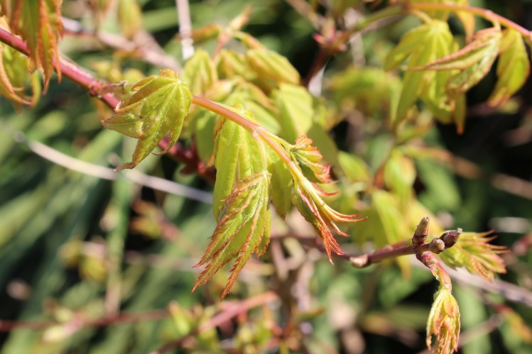 Lastly we have the unfolding fresh foliage, red-edged and vulnerable, of one of our many Woolies acers. Every one a winner baby.