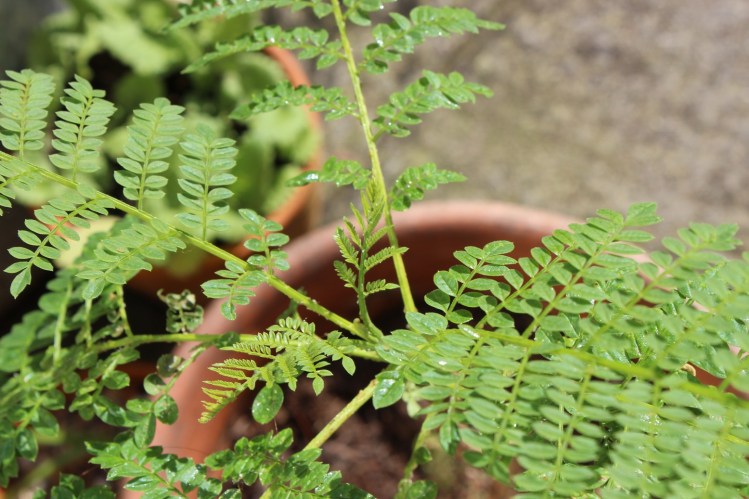 I am trying to get my Jacaranda mimosifolia re-accustomed to life in the big bad world by moving it outside during the daytime and bringing it back into the relative comfort of our dining room at night. It has been “in, out, in, out” but as yet there has been no “shaking it all about”.