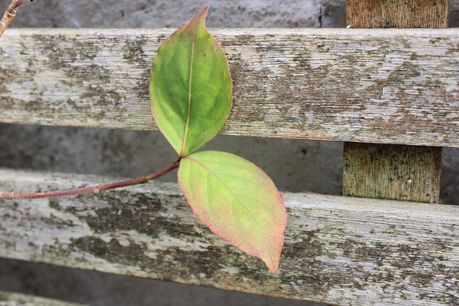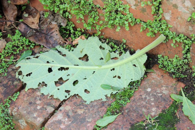 Now, a ravaged leaf, ripped from the nearby brugmansia by the wicked wind, dumped on the steps and subsequently chewed.