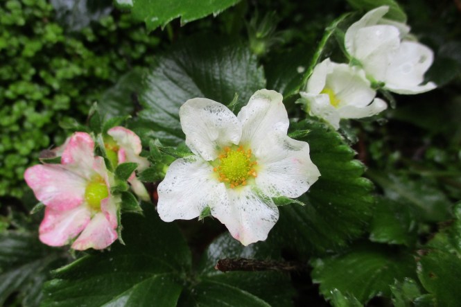 Rain sodden strawberry flowers, escapees from the orginal pot, which are thriving jammed between wall stones. Read into that what you may.