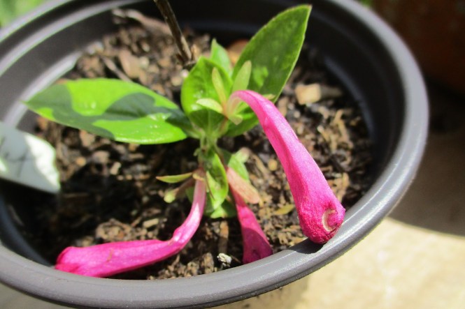 Now we have a cutting of Abelia floribunda which at 10cm tall is getting a little ahead of itself. Not yet, my lovely, concentrate of growing strong before you start showing off! I nipped off the bloom just after the photo was taken. Sometimes you have to be cruel to be kind.