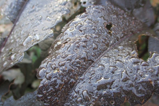 Next we have a tough, old, chewed and dewy leaf of a dark leaved dahlia. As the season progresses I care less about nibbling. Already my eye is set on next year’s finishing line.