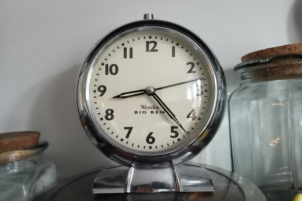 In the summer months, when visitors prowl the streets with eager purses, there was an infrequent car boot sale on the rugby pitch across the road from our house. It wasn’t a Ming vase, lost Turner masterpiece type of event, more a broken toys and scary ornaments affair. Still, as it wasn’t far, we used to visit just in case. And in all fairness we did pick up a few treasures, books, plants and this clock. When I bought it, for the grand sum of 50p, I was indulged rather than encouraged by my OH. “But” I argued “I love its chrome space-age sleekness, it is a prime example of the art of design”. And furthermore, it didn’t matter a hoot when the man on the stall confessed it didn’t work. Home it came and for the several years it lived on the mantlepiece in our bedroom where I would admire it for its gleaming beauty.