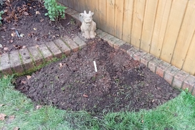 I had bulbs to plant. I had no pot to plant them in. So I made a mini bed and planted out Rodgeria ‘Heavenly Gill’. If ever a plant should not be in a pot, surely it is a rodgersia. Hopefully it will thrive here, it has struggled up to now.