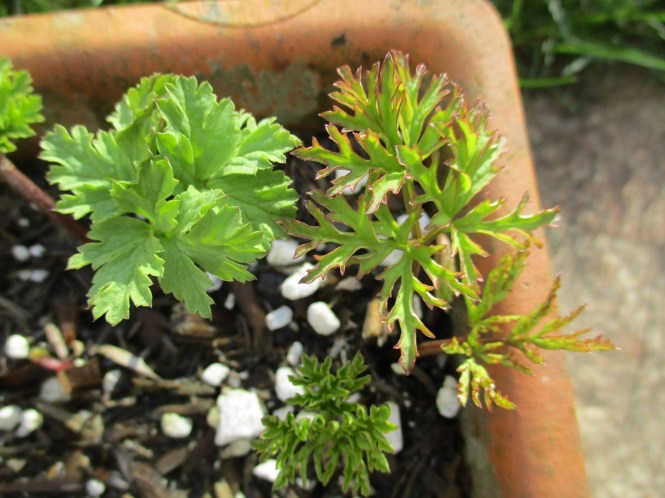 Not long before Christmas I planted Anemone Mistral Fucsia and Mistral Vinato together in a pot, thinking they would be good foils for each other. I have wanted to grow Italian anemones ever since I saw my friend Pat the Field holding a bunch of her wonderful cut flowers. Vinato is deepest purple with a sky blue eye and Fucsia is not a spelling mistake and fuchsia pink. They are emerging gracefully and I was interested to see that the foliage on each is quite different. We will see how efficiently they were mixed!
