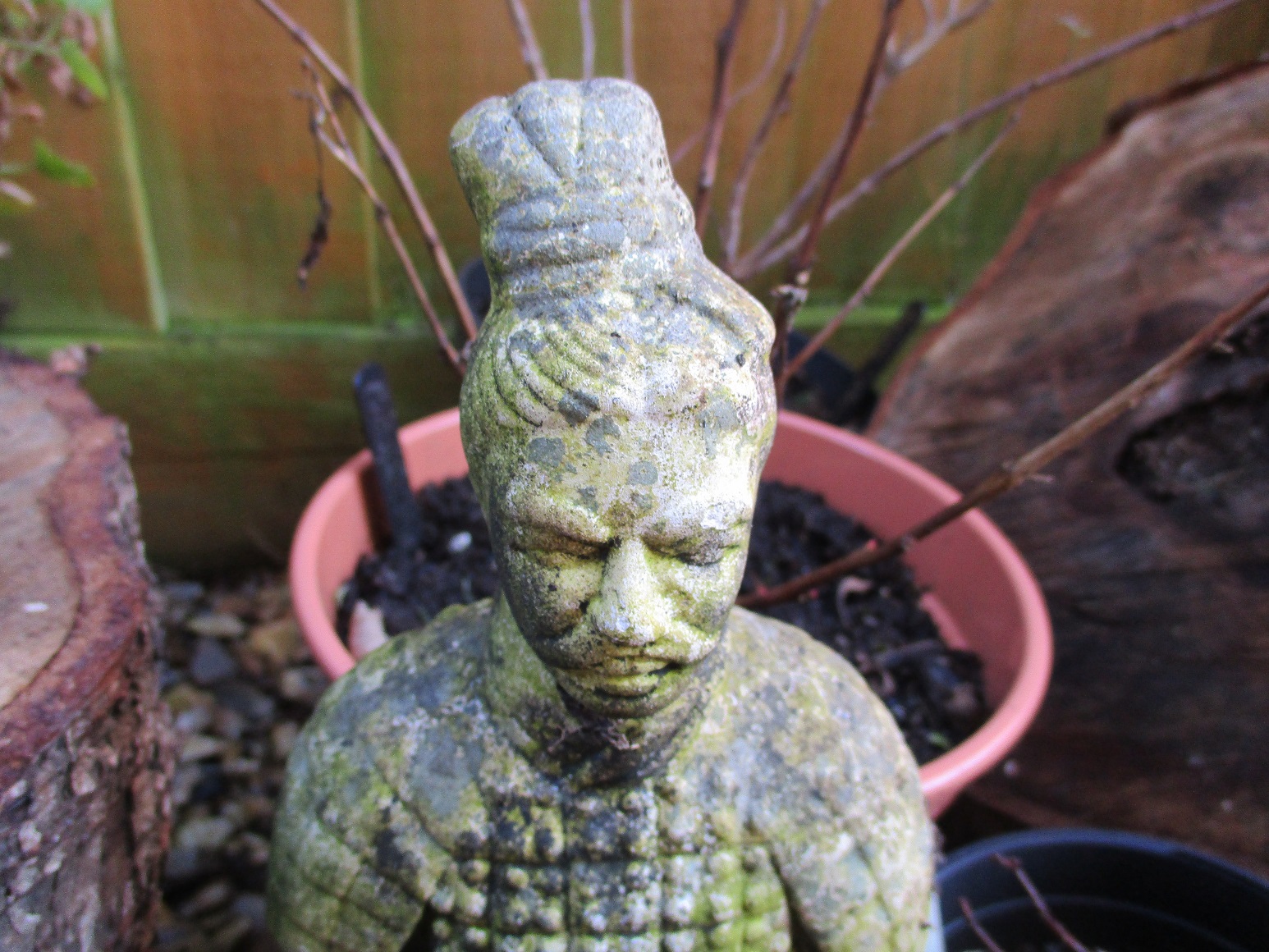 Many years ago, when we lived in Bristol, my OH bought me several replicas of soldiers from the Terracotta Army. Unfortunately, he couldn’t quite run to originals, and possibly they are better suited to a museum rather than my garden. They were dotted around in borders and have gradually succumbed to the fight. Except this one. He is the last man standing.