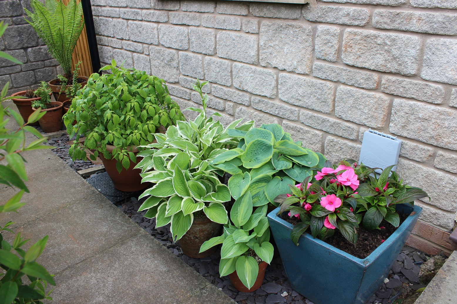 Ever ready to obey orders, and just for Granny, here is a picture of the front of the house. A 2m sliver of hypericum hedge, path and gravel. A very shady spot, it is potted up with Bob’s hostas, ferns and an impatiens, can’t remember which. Under the hedge are some of Prof Gadget’s London Pride and a few begonias. I am undecided about the hedge. There is a short wall behind it and doesn’t really offer any privacy or protection and I am not a great lover of it, for historical reasons. Nothing to do with Henry VIII, we had a lot of it in a former garden and I didn’t like it there either.