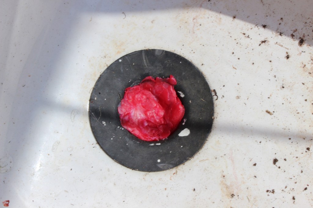 OH asked if I had a plug. I did my puzzled face until I realised he wanted it for the ceramic sink that he had placed underneath the other downpipe. Then, with an electric light bulb pulsating out of my head, I rushed into the kitchen. For a couple of weeks I have been saving the wax coating from the Babybel’s that we have a liking for in this house. Does that sound weird? I have been using it to top bamboo canes. It occurred to me it would make the perfect sink stopper-upper. What we had in reserve was a little meagre, so we were forced to eat a couple more to make a perfect seal. I did wonder that if it gets very hot again it might melt away!