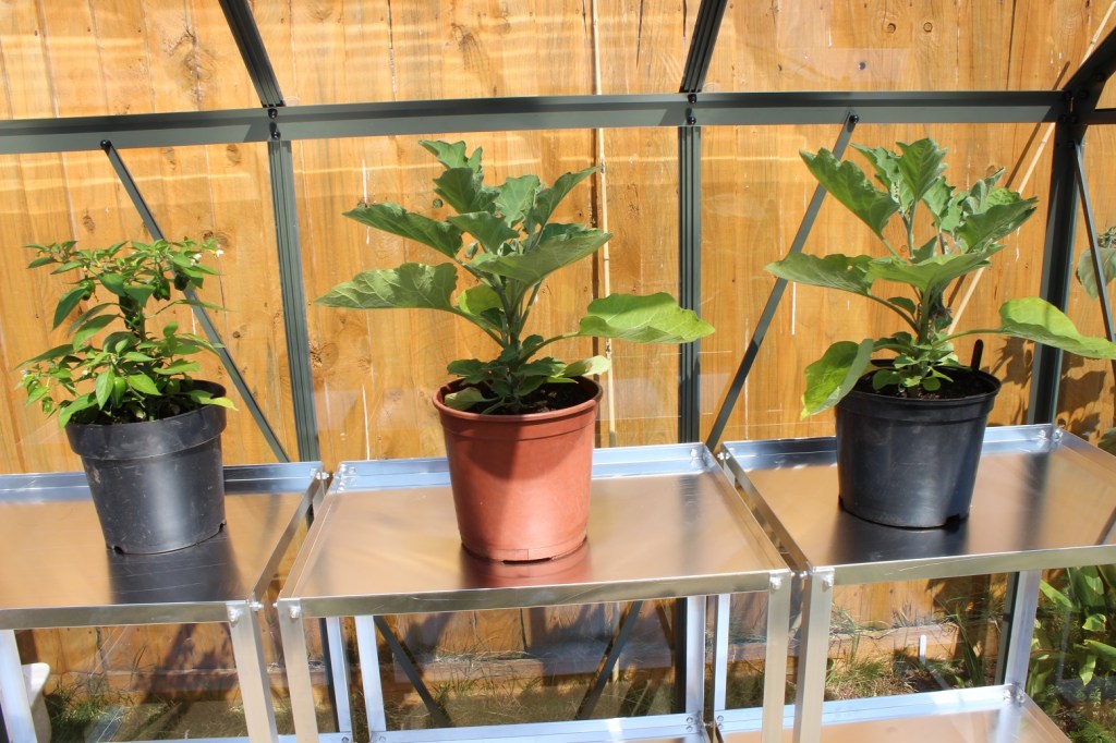 The first residents have arrived! A chilli pepper and two aubergines are now in situ. Since this photo a few others have shimmied in, including two manky cacti from the house and the shy to flower brugmansia.