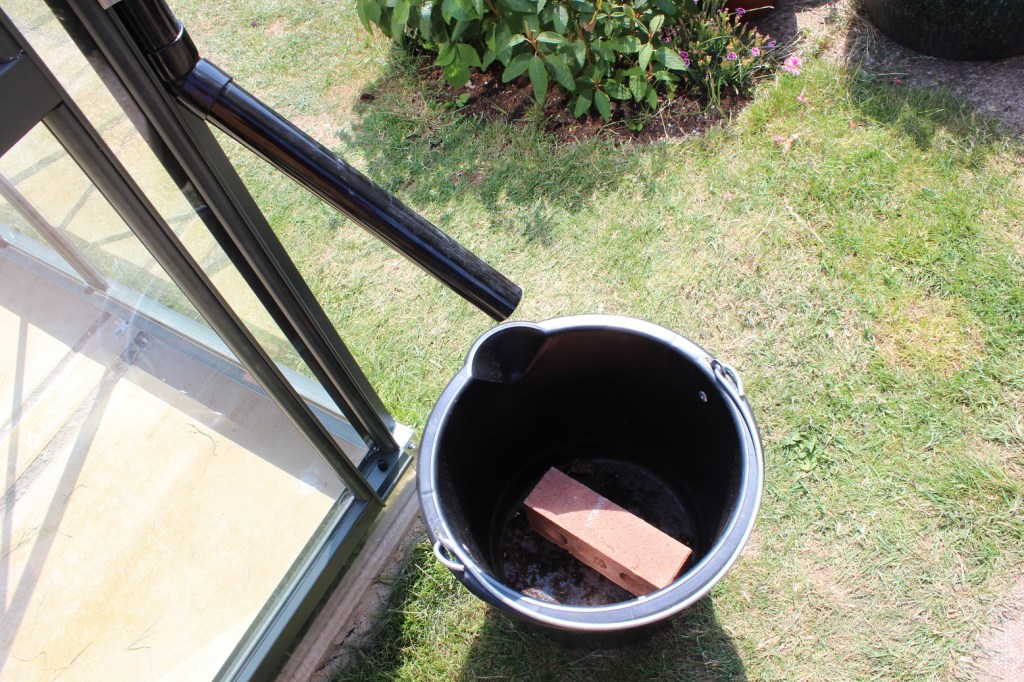 Here is one of our sophisticated add-ons. At some point we may get proper water catchers, but for now we have a bucket with a brick in it on one side. I’m thinking “industrial chic”.