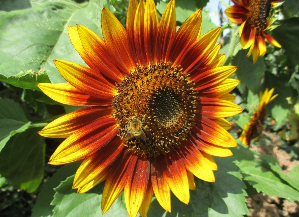 Let’s start with a stonker. Sunflower and bee. Never gets boring. These particular plants had fallen in a storm, when The Cloggies were visiting us earlier in the year. Clever that they are, the sunflowers had begun to grow upwards from their prone position. Now, the stem hoisted to the vertical, the blooms are bent towards the admirer and not high in the sky. Perfect.