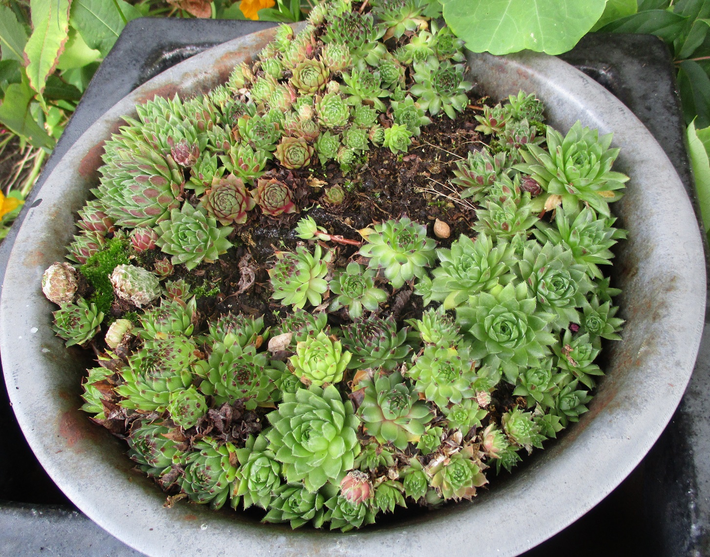 Sempervivums can get lost in the cut and thrust of a garden. If you elevate and contain, their true beauty can be appreciated. These are looking quite happy in their metal bowl.