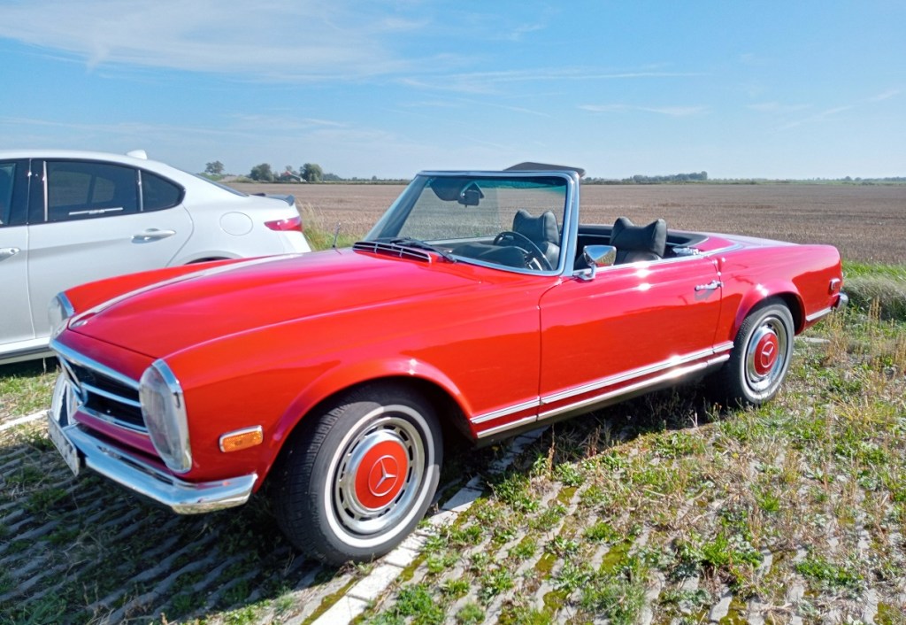 Shall we talk about holidays? That would be a pleasant diversion. Whilst in The Netherlands recently we visited Fort Sabina, built by Napoleon in 1810/11 as defense against the dastardly Brits. We love a bit of culture and love it even more if it has a good cafe with splendid cake, which it does. We were ably driven to this stronghold by my niece, who has recently passed her driving test, the journey soundtracked by a full running commentary from her father. As we approached the car park we noticed it was surprisingly almost full. On close inspection it seemed to be very full with classic cars. Our first job, of course, was to tour the site and to pick our favourite. The Maserati’s and Lamborghinis left me cold, but this Mercedes convertible sang a sweet song to me. It is the one I bagsied and we all know that bagsy is the law.