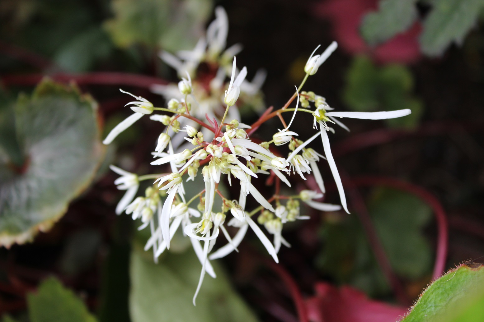 Earlier in the year I bought Saxifraga fortunei ‘Blackberry and Apple Pie’. It has struggled a little, frazzling hysterically at the mere glimpse of sun, even though it is in a shady part of the garden. It has been swamped by other less fussy souls, no room for slackers here, but today I noticed an elegant outreach of flowers. There is hope.