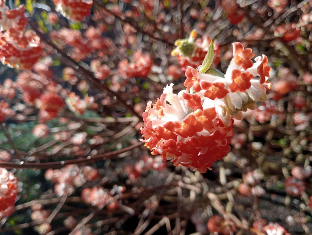 There was a jaw dropping start to our garden tour; several outrageous specimens of Edgeworthia ‘Red Dragon’ outshone their fragrant border companions of witch hazel and daphne.