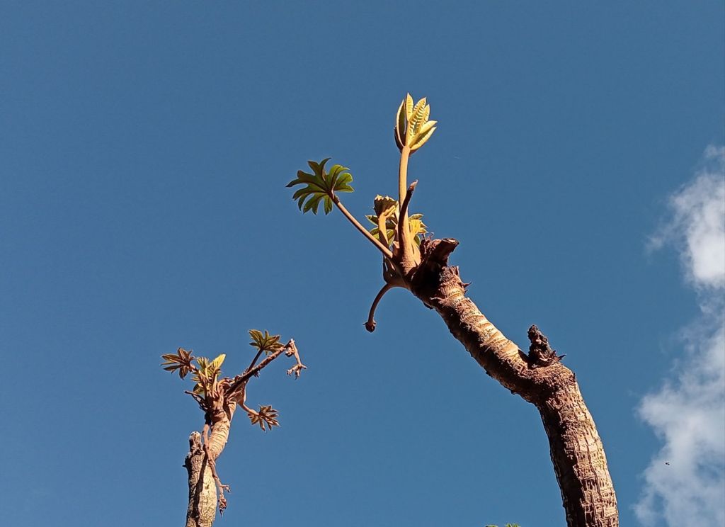 I think I’ve found the message, but who are you saying Hi! to? Spring or sunshine perhaps? Very nice photo of the tetrapanax with its new shoots this year.