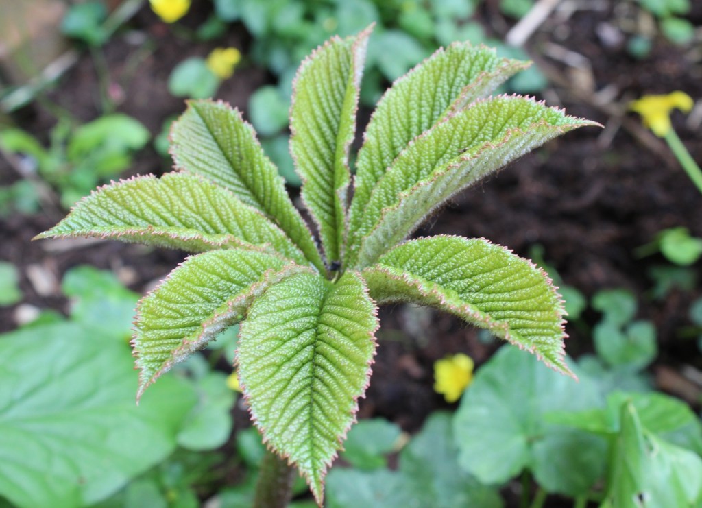 Rogersia ”Heavenly Gill’ is well on its way. Although I am fond of her when the leaves have grown and spread, I think it is at this stage, with crinkled juvenile foliage, that I love her most.