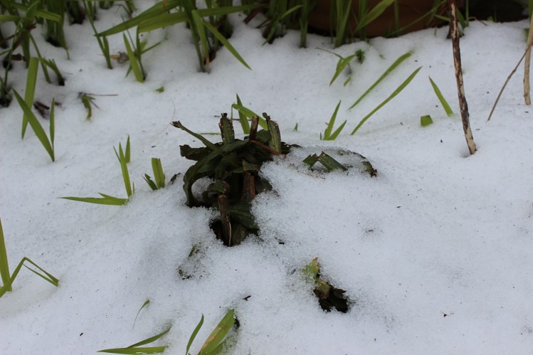 Next we have tulips, pushing their noses out of the snow. I have no doubt that soon these will be jollying up the front of my house. That might well be the kiss of death.